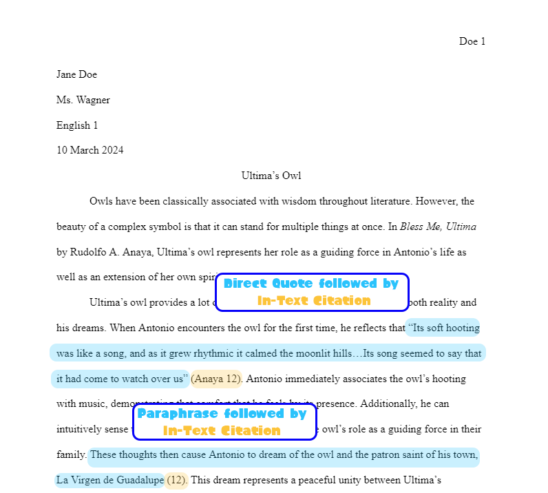 This in-text citation should appear AFTER the quote or paraphrase, but BEFORE the ending punctuation of your sentence.