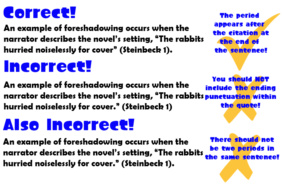 Below are some common mistakes related to in-text citations that I have seen students make in the past. Review the following mistakes so that you can avoid them in the future! And, if you’ve made these mistakes before, that’s okay: mistakes are just part of the learning process! MLA in particular can be very tricky so don’t worry if you don’t get it right away. It will make more sense with practice and time!