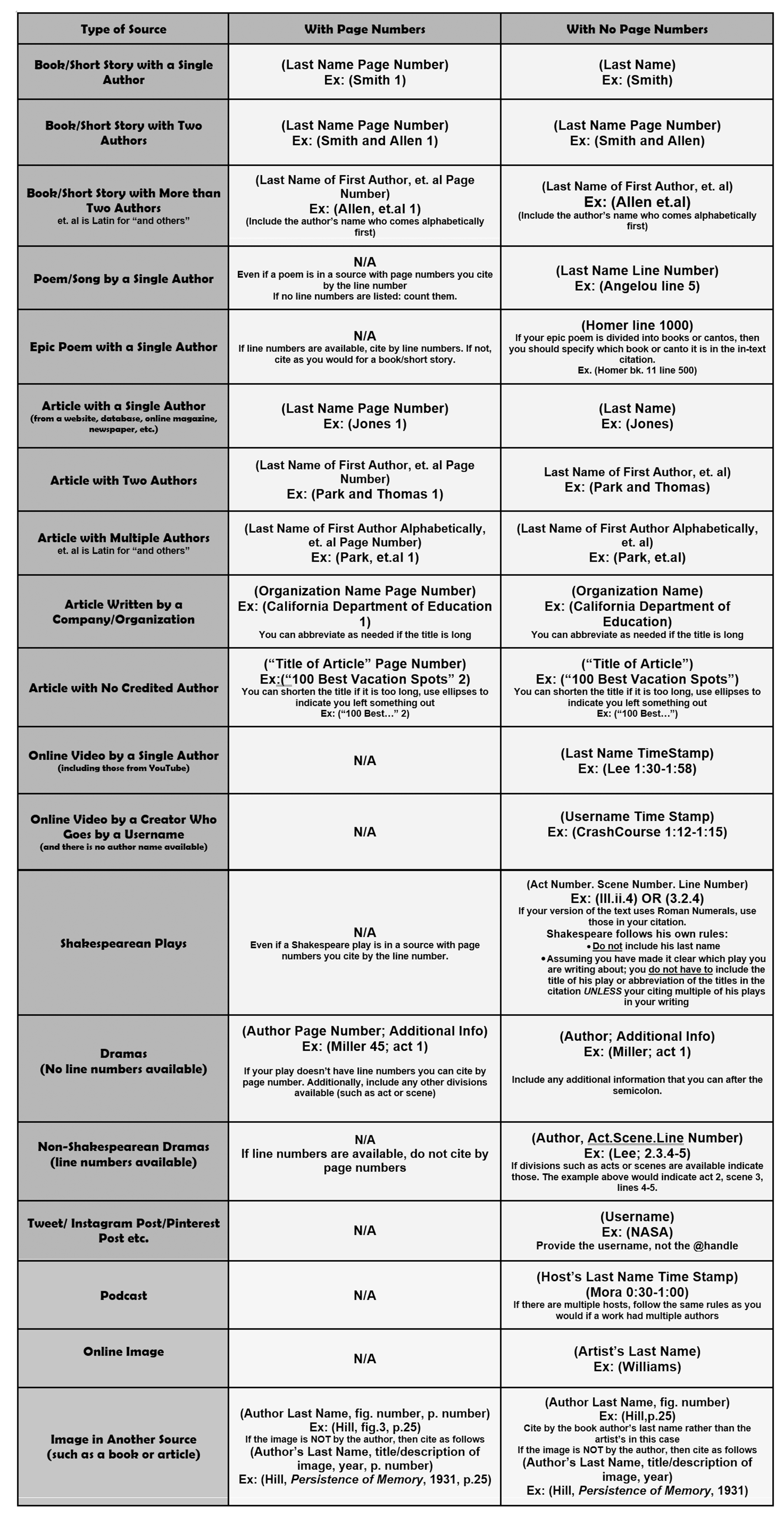 MLA has specific guidelines that you should follow for all possible sources that you could cite in your writing including articles, YouTube videos, poems, plays, and even social media posts! Below you will find a chart with specific directions for each source type as well as examples. Note that this chart does not cover EVERY possible source type, but does cover the ones you are most likely to encounter in your research.