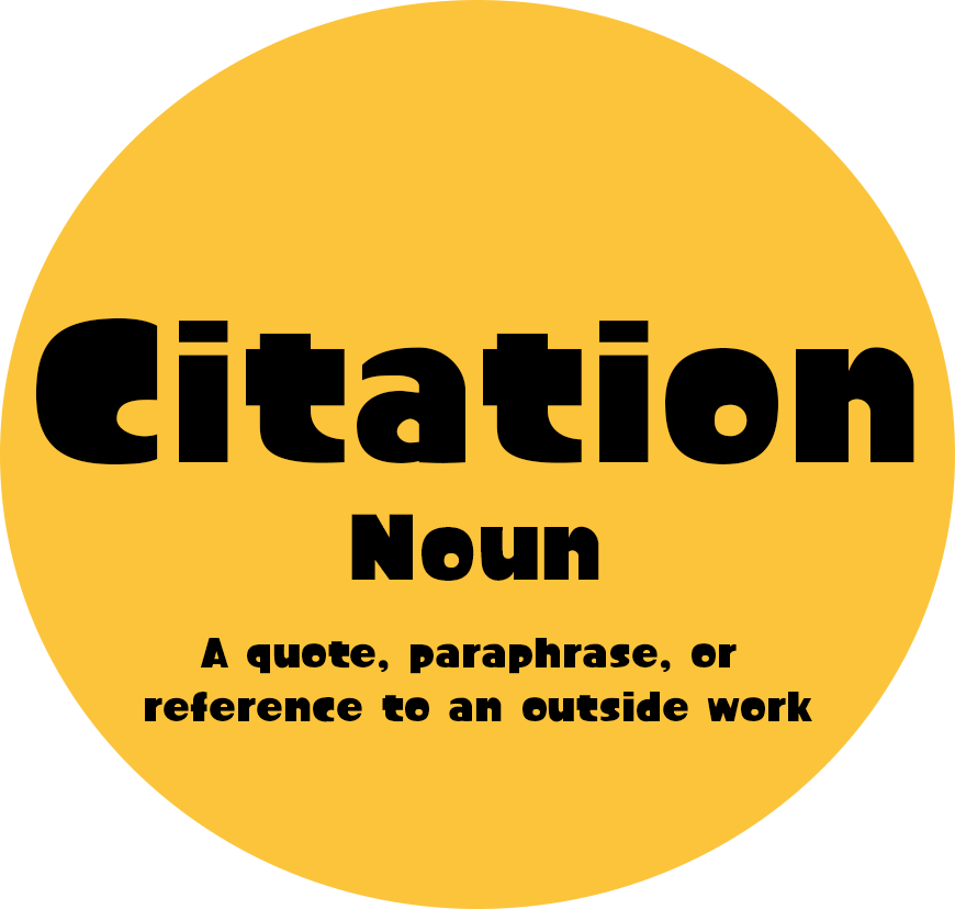 In writing, a CITATION is a reference to an outside source such as a piece of literature, poem, article, or website. CITATIONS can help strengthen your claims and analysis by providing textual support.
