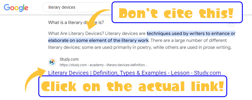 Google is a search engine and can be a helpful resource when looking for research. However, many students mistake Google’s suggestions either at the top of your search or in the drop down quick responses as being written by Google. These are merely just previews of the actual source or website. You must cite the actual website your information came from—not just the Google search that got you there!